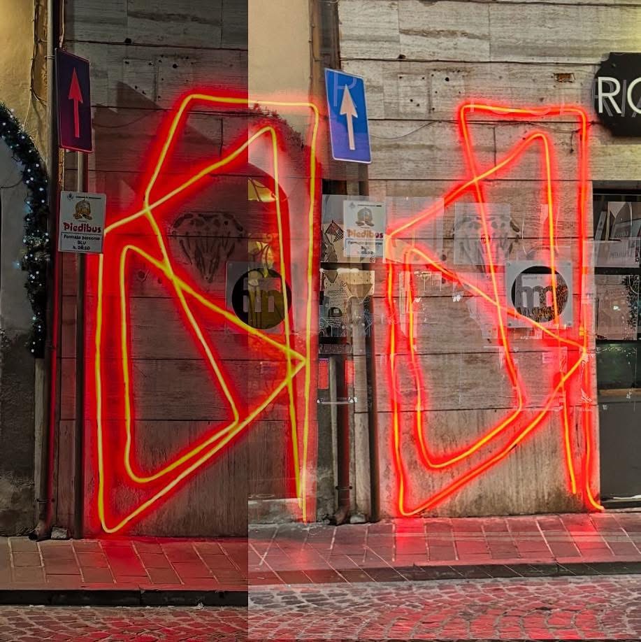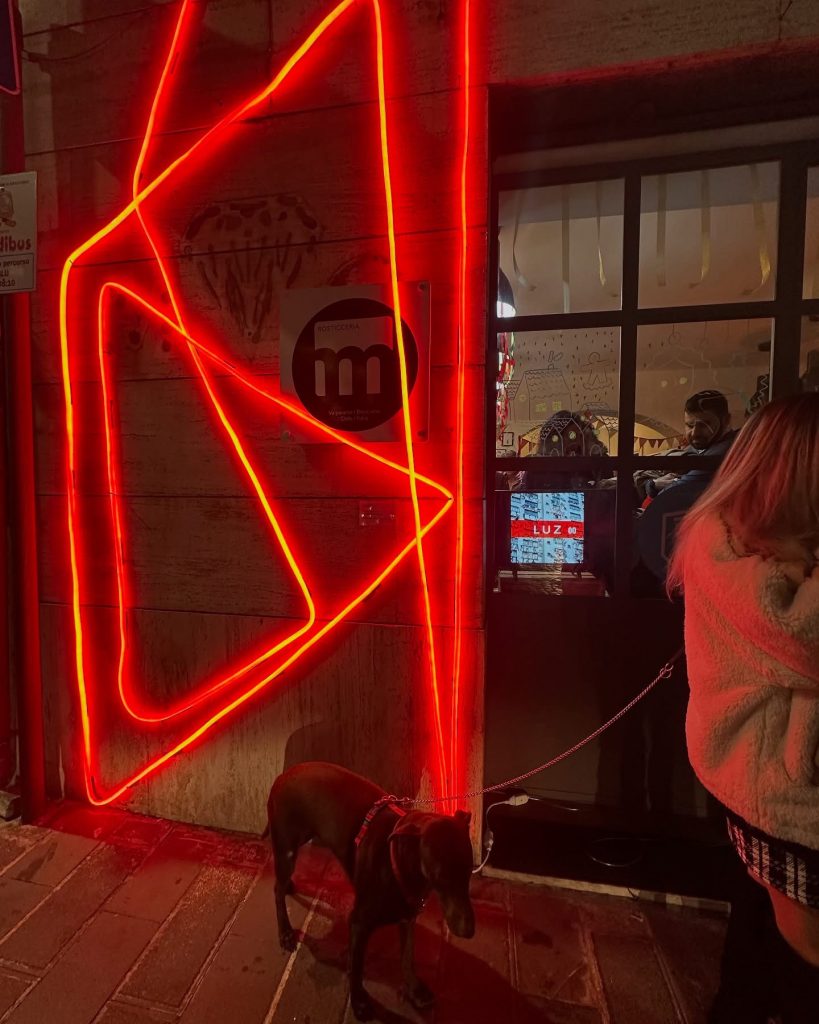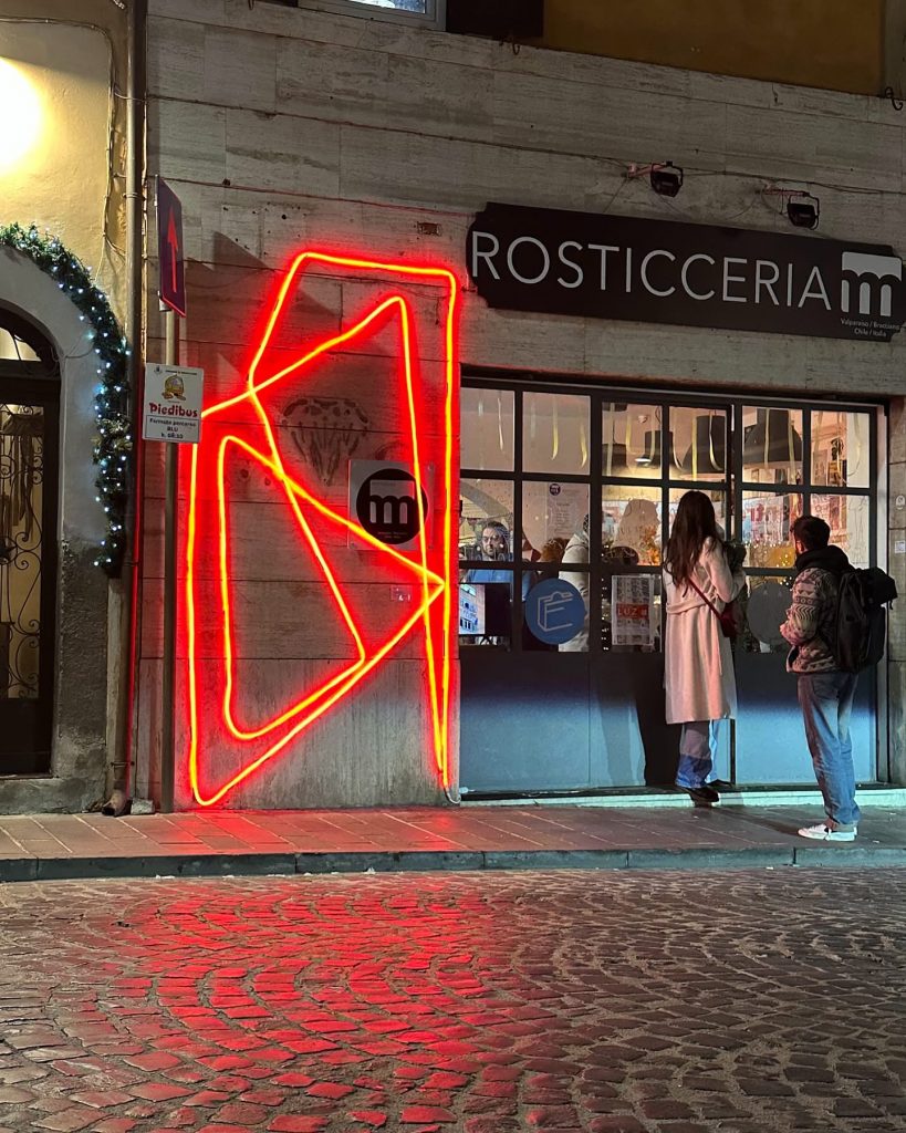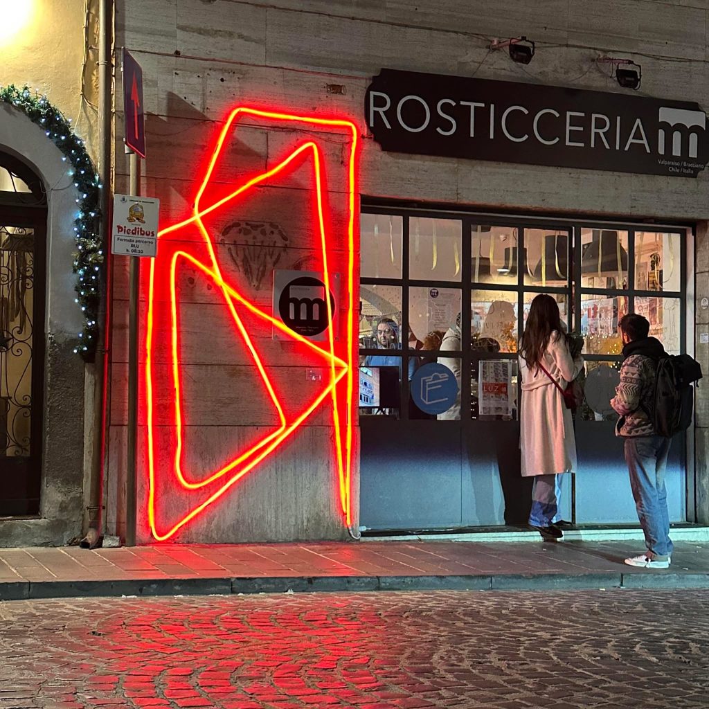 una lettera alta, al neon rosso, che emerge come una presenza fuori da una rosticceria. Il gesto stesso conta, la forma stilizzata porta con sé un messaggio di controcultura e resistenza.